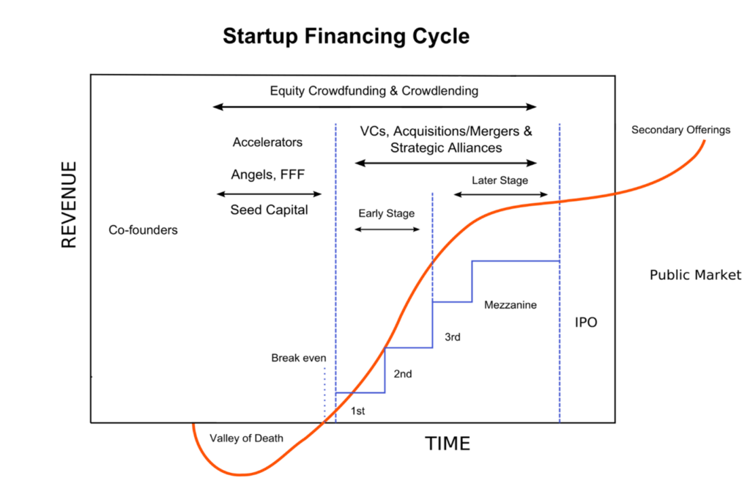 In bovenstaande grafiek is de zogenaamde 'Startup Financing Cycle' geschetst. Dit geeft een eerste beeld welke instrumenten aansluiten bij de fase waarin je onderneming zich bevindt. We knippen de financieringsrondes op in vier fases (al kunnen er ook meerdere financieringsrondes zijn in een bepaalde fase):
